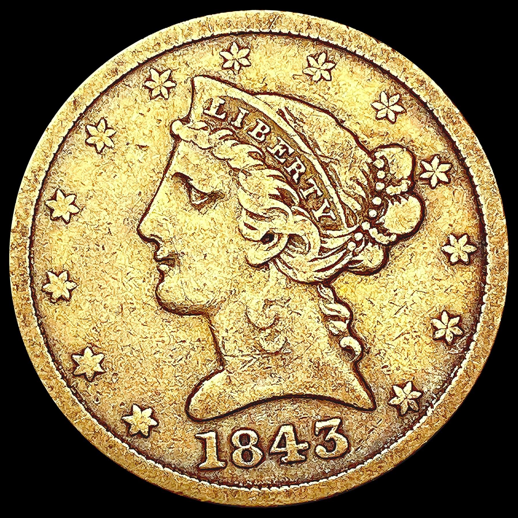 1843 $5 Gold Half Eagle NICELY CIRCULATED