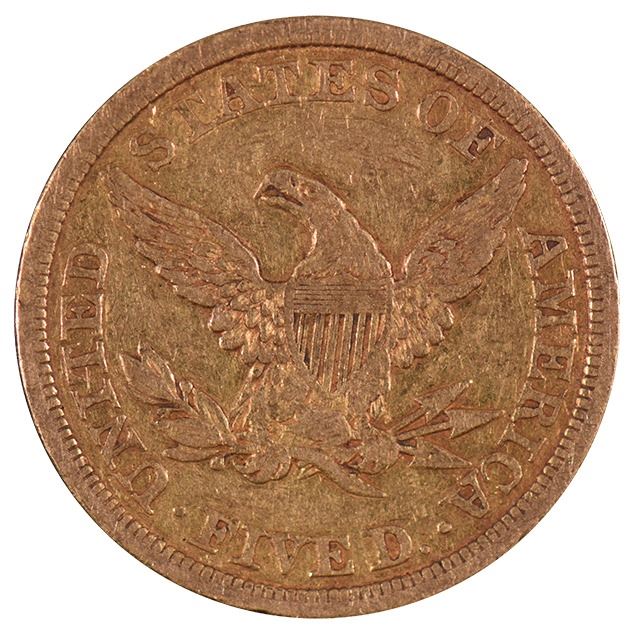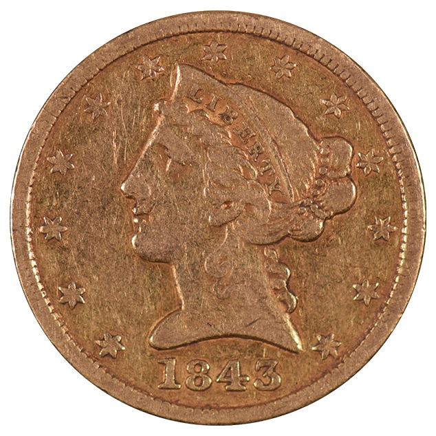 One 1843 $5 Liberty Head Half Eagle Gold Coin.
