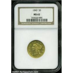 <table><tr><td><TABLE cellSpacing=0 cellPadding=0 width="100%" bgColor=#000000 border=0><TBODY> <TR><TD width="100%"><TABLE cellSpacing=1 cellPadding=3 width="100%" border=0><TBODY><TR><TD width="100%" bgColor=#79735c><FONT face=arial color=#ffffff size=3><B>Description</B> </FONT></TD></TR><TR><TD width="100%" bgColor=#ffffff><FONT face=arial size=2><B>1843 $5 MS62 NGC.</B></I> With a mintage of 611,205 pieces it is a wonder that more high grade examples of this date were not set aside. However, enough were so that the 1843 is the second most frequently encountered half eagle from the 1840s. However, that only points out the absolute rarity of all the issues from this decade as only 14 other MS64 coins have been so graded by NGC with 14 finer (7/03). This is a lovely green-gold example that is fully struck throughout. Numerous small abrasions account for the grade, but the only ones worthy of mention are a V-shaped pair behind Liberty's mouth and a couple of shallow scrapes below (STATE)S on the reverse. </FONT></TD></TR></TBODY></TABLE></TD></TR></TBODY></TABLE><BR><A name=PricesRealized></A><TABLE cellSpacing=0 cellPadding=0 width="100%" bgColor=#000000 border=0><TBODY><TR><TD width="100%"><TABLE cellSpacing=1 cellPadding=3 width="100%" border=0><TBODY><TR><TD width="100%" bgColor=#79735c><A name=PR><FONT face=arial color=#ffffff size=3><B>Previous Prices from Heritage Auctions</B> </FONT></A></TD></TR><TR><TD bgColor=#f6f6ed><TABLE cellSpacing=0 cellPadding=0 width="100%" border=1><TBODY><TR><TD align=middle width="33%"><B>Date</B></TD><TD align=middle width="33%"><B>Service</B></TD><TD align=middle width="33%"><B>Price</B></TD></TR><TR bgColor=whitesmoke><TD width="33%"><B>11/23/2002</B></TD><TD width="33%">NGC</TD><TD width="33%">$1,840.00</TD></TR><TR bgColor=whitesmoke><TD width="33%"><B>01/05/2001</B></TD><TD width="33%">NGC</TD><TD width="33%">$2,415.00</TD></TR><TR bgColor=whitesmoke><TD width="33%"><B>01/01/1994</B></TD><TD width="33%">NGC</TD><TD width="33%">$2,310.00</TD></TR></TBODY></TABLE></TD></TR><TR><TD bgColor=#ffffff><FONT face=arial size=1 ?>PLEASE NOTE: All prices realized reflect the final hammer price PLUS the buyer's premium in auctions that charge a buyer's premium. Each item has a notation at the top of the listing indicating whether that lot included a buyer's premium. Example: A item that sells with a final hammer price of $100 and a 20% buyer's premium will display with a price realized of $120. All information listed is intended to be as accurate as possible, but errors are possible. Please use this guide carefully and inform us of any inaccuracies. </FONT></TD></TR></TBODY></TABLE></TD></TR></TBODY></TABLE><BR><TABLE cellSpacing=0 cellPadding=0 width="100%" bgColor=#000000 border=0><TBODY><TR><TD width="100%"><TABLE cellSpacing=1 cellPadding=3 width="100%" border=0><TBODY><TR><TD width="100%" bgColor=#79735c colSpan=6><FONT face=arial color=#ffffff size=3><B>Price Guide*</B> </FONT></TD></TR><TR bgColor=#f6f6ed><TD align=middle><B>Grade</B> </TD><TD align=middle><B>Coin World<BR>(Trends)</B> </TD><TD align=middle><B>Numismedia<BR>Retail</B> </TD><TD align=middle><B>Numismedia<BR>Wholesale</B> </TD><TD align=middle><B>Coin<BR>Universe</B> </TD><TD align=middle><B>Heritage<BR>Value Index</B> </TD></TR><TR bgColor=#ffffff><TD align=middle>61</TD><TD align=right>---</TD><TD align=right>---</TD><TD align=right>$1,750.00</TD><TD align=right>$2,500.00</TD><TD align=right>$1,978.13</TD></TR><TR style="FONT-WEIGHT: bold" bgColor=#cccfdd><TD align=middle>62</TD><TD align=right>$3,750.00</TD><TD align=right>---</TD><TD align=right>$2,550.00</TD><TD align=right>$4,500.00</TD><TD align=right>$3,246.88</TD></TR><TR bgColor=#ffffff><TD align=middle>63</TD><TD align=right>$9,500.00</TD><TD align=right>---</TD><TD align=right>$6,150.00</TD><TD align=right>$9,500.00</TD><TD align=right>$6,683.33</TD></TR><TR bgColor=#ffffff><TD colSpan=6><FONT size=1>*All information listed is intended to be as accurate as possible, but errors are possible. No item may be returned or refused based on this information which is provided as a service to our customers. You should contact each pricing source directly to determine the accuracy of this information. </FONT></TD></TR></TBODY></TABLE></TD></TR></TBODY></TABLE><BR><TABLE cellSpacing=0 cellPadding=0 width="100%" bgColor=#000000 border=0><TBODY><TR><TD width="100%"><TABLE cellSpacing=1 cellPadding=3 width="100%" border=0><TBODY><TR><TD width="100%" bgColor=#79735c><FONT face=arial color=#ffffff size=3><B>Population Guide</B> </FONT></TD></TR><TR bgColor=#ffffff><TD align=middle><!-- Begin Output of Population Grid--><TABLE cellSpacing=0 cellPadding=0 width="100%" border=0><TBODY><TR><TD vAlign=center><TABLE cellSpacing=0 width="100%" border=1 cellsadding="3"><TBODY><TR><TD vAlign=center><TABLE cellSpacing=0 cellPadding=3 width="100%" border=1><TBODY><TR><TD vAlign=center align=middle bgColor=#f0f1e8 colSpan=2 <CENTER><FONT face=Arial size=2><B>PCGS Pop </B></FONT><CENTER></CENTER></TD><TD vAlign=center align=middle bgColor=#f0f1e8 colSpan=2><CENTER><FONT face=Arial size=2><B>NGC Pop</B></CENTER></FONT></TD></TR><TR><TD vAlign=center><FONT face=Arial size=2>(62)</FONT> </TD><TD vAlign=center align=right><FONT face=Arial size=2>4</FONT> </TD><TD vAlign=center><FONT face=Arial size=2>(62)</FONT> </TD><TD vAlign=center align=right><FONT face=Arial size=2>15</FONT> </TD></TR><TR><TD vAlign=center><FONT face=Arial size=2>(>62)</FONT> </TD><TD vAlign=center align=right><FONT face=Arial size=2>4</FONT> </TD><TD vAlign=center><FONT face=Arial size=2>(>62)</FONT> </TD><TD vAlign=center align=right><FONT face=Arial size=2>14</FONT> </TD></TR></TBODY></TABLE></TD></TR></TBODY></TABLE></TD></TR></TBODY></TABLE><!-- End Output of Population Grid--></TD></TR></TBODY></TABLE></TD></TR></TBODY></TABLE><BR><TABLE cellSpacing=0 cellPadding=0 width="100%" bgColor=#000000 border=0><TBODY><TR> Important notice: Heritage usually auctions material at the rat