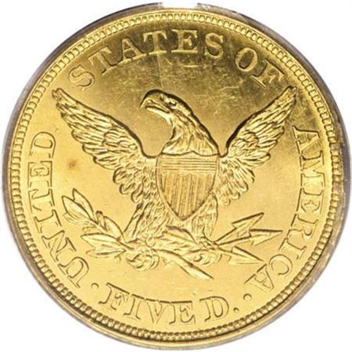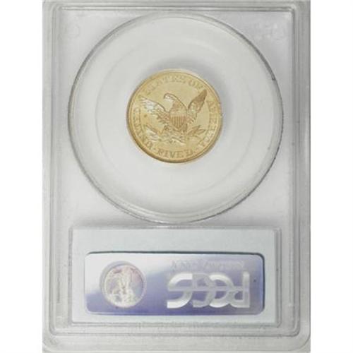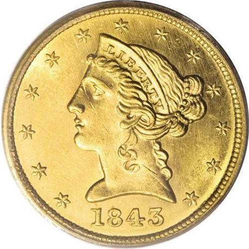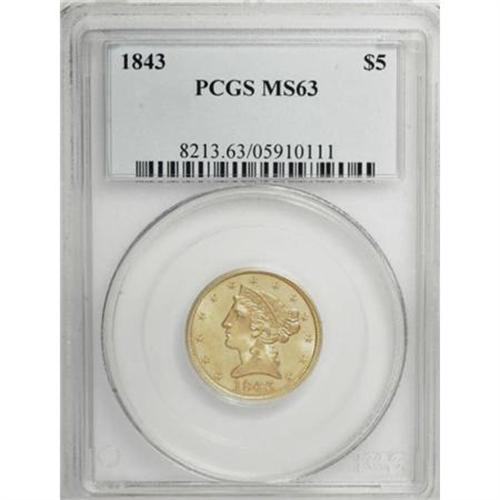 <B>1843 $5 MS63 PCGS.</B></I> Frosty motifs are highlighted by the semi-prooflike fields of this Select half eagle that display die polish lines, especially on the reverse. An attentive strike brings out crispness on the design features, heightening the coin's eye appeal. Some obverse handling marks limit the grade. Population: 4 in 63, 3 finer (11/07).<BR><BR><B>Coin Engraver:</B> Christian Gobrecht<BR><BR><b>Shipping:</b> Coins & Currency (<a target="_blank" href="http://www.heritageauctions.com/common/shipping.php">view shipping information</a>)