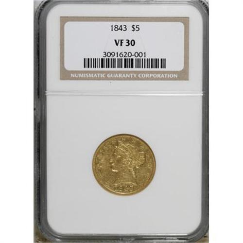 <B>1843 $5 VF30 NGC.</B></I> . NGC Census: (2/385). PCGS Population (3/203). Mintage: 611,205. Numismedia Wsl. Price for NGC/PCGS coin in VF30: $227. (#8213)<BR><BR><B>Coin Engraver:</B> Christian Gobrecht<BR><BR><b>Shipping:</b> Coins & Currency (<a target="_blank" href="http://www.heritageauctions.com/common/shipping.php">view shipping information</a>)