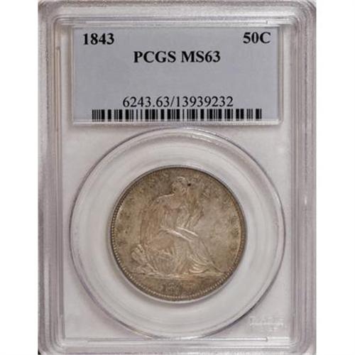 <B>1843 50C MS63 PCGS.</B></I> This piece is sharply struck on almost all of the design elements, save for the eagle's left (facing) talons. The variegated coloration shows mainly light shades of gray, green, and gold. Small marks and a couple of shallow pinscratches limit the grade. Conditionally scarce at this grade level or finer. Population: 19 in 63, 7 finer (1/08). <BR><BR><B>Coin Engraver:</B> Christian Gobrecht<BR><BR><b>Shipping:</b> Coins & Currency (<a target="_blank" href="http://www.heritageauctions.com/common/shipping.php">view shipping information</a>)