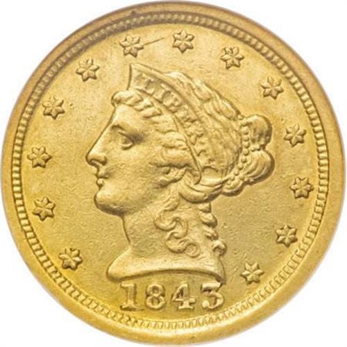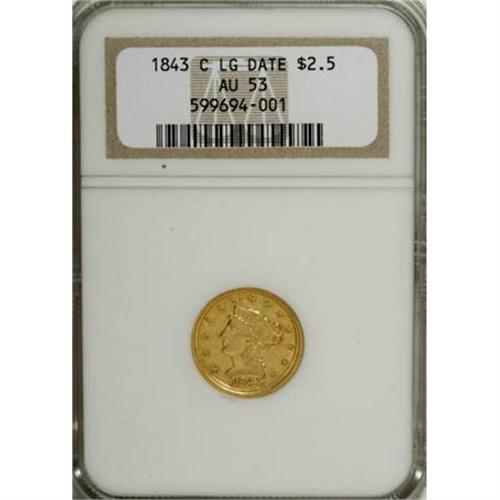 <B>1843-C $2 1/2 Large Date, Plain 4 AU53 NGC.</B></I> Variety 5-D. Remaining luster is substantial for the grade, and the strike is good despite unimportant blending on the eagle's left (facing) leg. Honey-gold toning contributes further to the eye appeal. Just 23,076 pieces were struck. Census: 22 in 53, 60 finer (10/07).<BR><BR><B>Coin Engraver:</B> Christian Gobrecht<BR><BR><b>Shipping:</b> Coins & Currency (<a target="_blank" href="http://www.heritageauctions.com/common/shipping.php">view shipping information</a>)