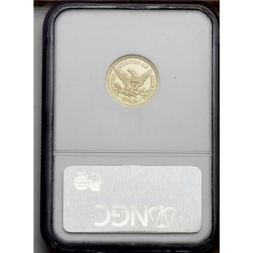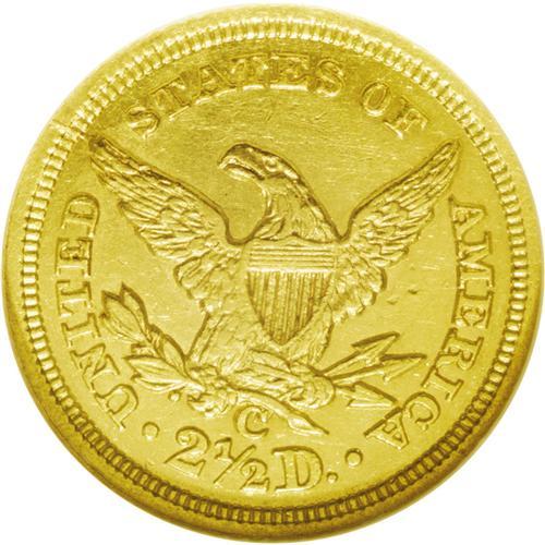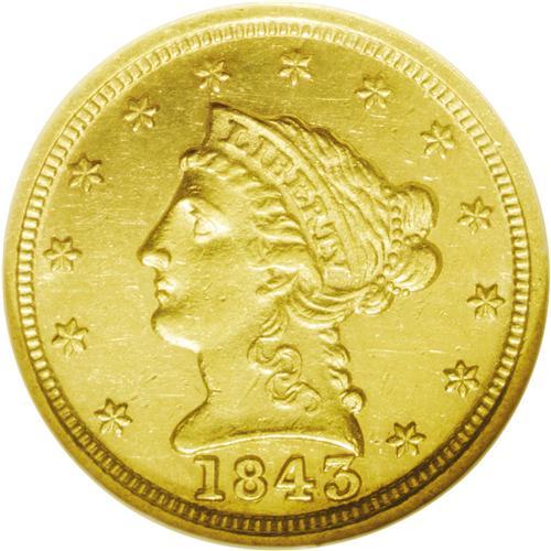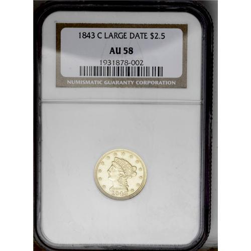 <B>1843-C<$2 1/2> Large Date, Plain 4 AU58 NGC.</B></I> Variety 5-D. The 8 in the date is repunched south, and the mintmark is sharply recut west. This bright Charlotte quarter eagle is sharply impressed for its branch mint status, and rotation beneath a light reveals substantial flashy luster. A couple of brief marks on the lower obverse do not distract the eye.