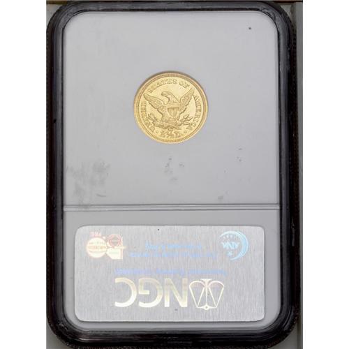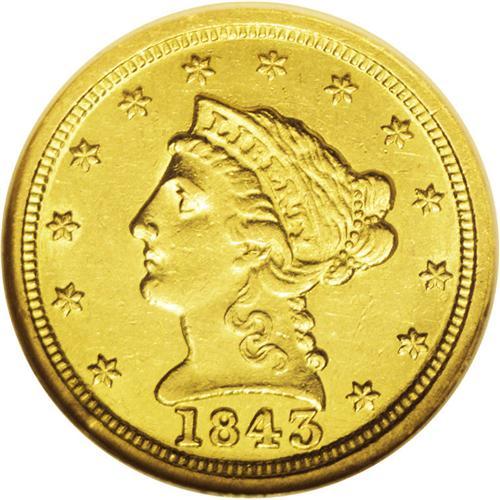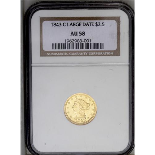 <B>1843-C<$2 1/2> Large Date, Plain 4 AU58 NGC.</B></I> Variety 5-D. The usual Large Date dies with the lightly repunched date and mintmark. Well struck on the obverse, although the reverse center shows moderate softness. A minor obverse rim ding at 7:30 will be missed by most observers. Census: 24 in 58, 12 finer (6/06).