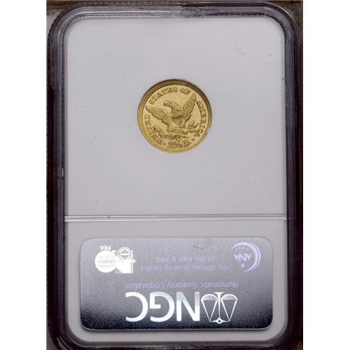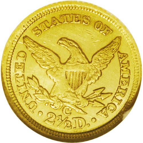 <B>1843-C<$2 1/2> Large Date, Plain 4 MS60 NGC.</B></I> Variety 5-D. Two different date sizes are known. The Large Date has a Plain 4 in the date, without a serif on the crossbar. The mintmark is also widely repunched. The Small Date has a serif or "crosslet" at the right end of the crossbar. This issue is usually found in VF, and becomes very rare above that level. The present Uncirculated specimen displays luster in the recessed areas of the yellow-gold surfaces. Portions of Liberty's hair and the eagle's feathers are weak. Numerous light handling marks are noted over each side.