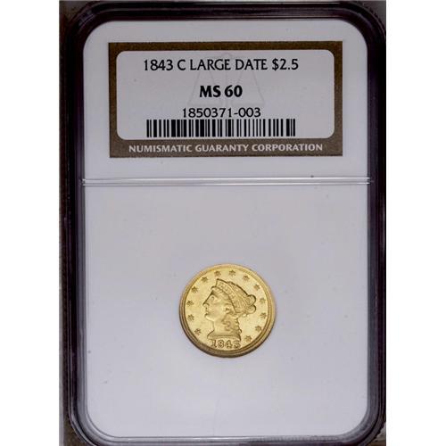 1843-C $2 1/2 Large Date, Plain 4 MS60 NGC. Variety 5- 1843-C