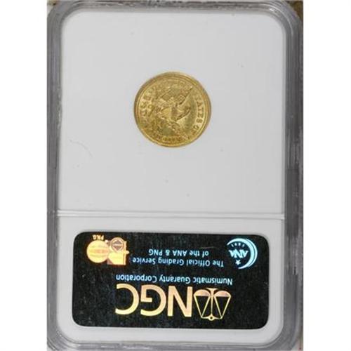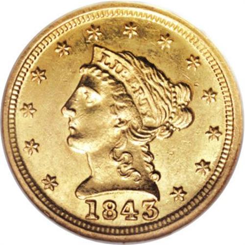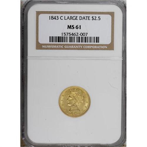 <B>1843-C $2 1/2 Large Date, Plain 4 MS61 NGC.</B></I> Variety 5-D. Bright yellow-gold surfaces exhibit a hint of greenish color. This piece is sharply struck and minimally abraded. The two varieties of this date are easily distinguished by the presence of a crosslet 4 on the Small Date and a plain 4 on the Large Date. The Large Date variety is easily the more common of the two, yet it is elusive in Mint State grades. Census: 7 in 61, 6 finer (6/07).<BR><BR><b>Shipping:</b> Coins & Currency (<a target="_blank" href="http://www.heritageauctions.com/common/shipping.php">view shipping information</a>)