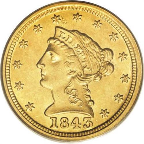 <B>1843-C $2 1/2 Large Date, Plain 4 MS61 PCGS.</B></I> Variety 5-D. All four date digits are lightly repunched, and the mintmark is recut along its left border. A beautiful sun-gold Charlotte half eagle that boasts clean surfaces and an above average strike. Struck from widely rotated dies. Population: 3 in 61, 5 finer (3/08).<BR><BR><B>Coin Engraver:</B> Christian Gobrecht<BR><BR><b>Shipping:</b> Coins & Currency (<a target="_blank" href="http://www.heritageauctions.com/common/shipping.php">view shipping information</a>)