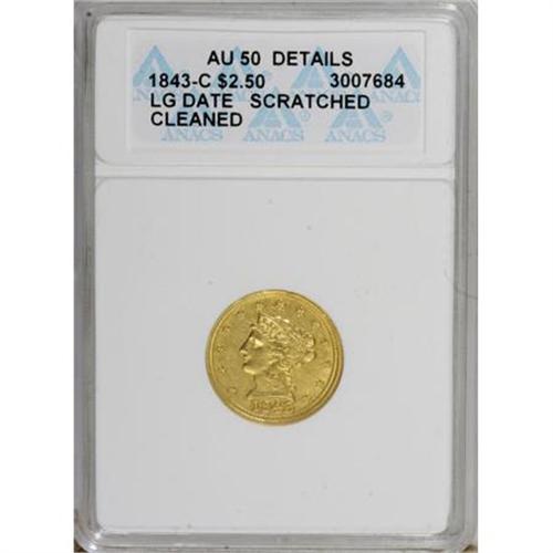 <B>1843-C $2 1/2 Large Date, Plain 4--Scratched, Cleaned--ANACS. AU50 Details.</B></I> Variety 5-D. Peripheral design details are precisely defined, although the centers are typically struck. Subdued by a chemical cleaning, and a few hair-thin scratches cross the portrait.<BR><BR><B>Coin Engraver:</B> Christian Gobrecht<BR><BR><b>Shipping:</b> Coins & Currency (<a target="_blank" href="http://www.heritageauctions.com/common/shipping.php">view shipping information</a>)