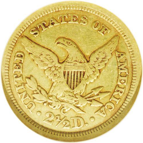 <B>1843-C<$2 1/2> Small Date, Crosslet 4 AU50 NGC.</B></I> Variety 4-C. Die State II. The presence of an 1843-C Small Date quarter eagle is significant in any auction. Among Charlotte quarter eagles it has the lowest mintage with only 2,988 pieces delivered from a single pair of dies on December 23, 1842. It also has the lowest total number of coins known in all grades with only 50-60 pieces believed extant today. Of course, most of the survivors are heavily clustered in the VF-XF grade ranges, and AU coins are quite scarce. The Condition Census for this issue is surprisingly high with all the coins on the current C.C. in mint condition, perhaps indicating that a disproportionate number were set aside in high grade at the time of issue. As always, the obverse of this piece is better struck than the reverse. The surfaces are surprisingly clean for the issue and show deep reddish patina surrounding the devices.