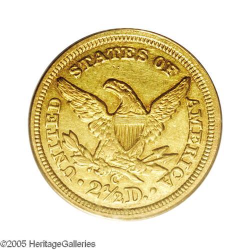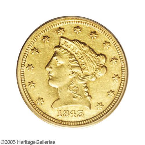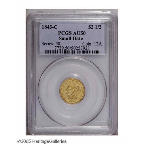 <B>1843-C<$2 1/2> Small Date, Crosslet 4 AU50 PCGS.</B></I> Variety 4-C. The dates on Gobrecht's Coronet Head design (1840-1907) were small in the years 1840-1843, changing later that year to a larger size. The 1843-C Small Date, with a mintage of just 2,988 pieces, is the rarer of the two 1843 Charlotte varieties. In fact, in terms of the number of survivors, the 1843-C Small Date is believed to be the rarest Quarter Eagle issue from the Charlotte Mint. According to the standard reference for C-mint gold, Douglas Winter's <I>Gold Coins of the Charlotte Mint,</B></I> only 50 to 60 pieces are known in all grades. The present crisply struck lemon-gold representative is void of abrasions visible with the naked eye, although both sides exhibit wispy slide marks when viewed beneath a loupe. Population: 6 in 50, 21 finer (10/05).
