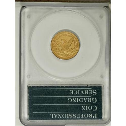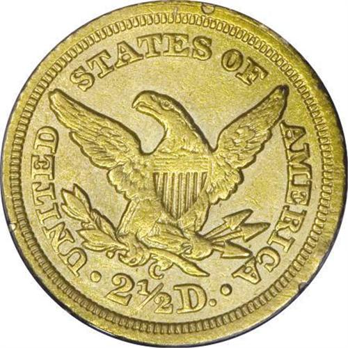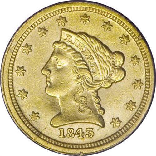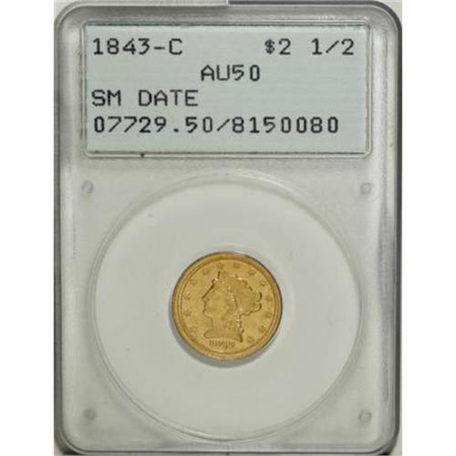 <B>1843-C $2 1/2 Small Date, Crosslet 4 AU50 PCGS.</B></I> Variety 4-C. Die State III with a noticeable bulge in the lower left obverse field. The strike is somewhat irregular on the obverse, as always seen on the late die state of this variety; the reverse is relatively well detailed with good sharpness on the feathers and claws. Both the obverse and the reverse are a bit dull and show some slight roughness. It is possible that this is mint-made but it is more likely that this piece was either been buried at one time or, more likely, it was exposed to seawater. As a result, the surfaces are lackluster but are covered with a light yellow-gold color that is appealing. This piece should be viewed in-person to accurately formulate a bid but it is nicer than described. Housed in an older PCGS holder.<BR> The 1843-C Small Date is the rarest Charlotte quarter eagle from the standpoint of total number known. There are probably around 65-75 pieces in existence with most grading from VF30 to XF45.<I><BR>From The Carolina Circle Collection.</B></I><BR><BR><B>Coin Engraver:</B> Christian Gobrecht<BR><BR><b>Shipping:</b> Coins & Currency (<a target="_blank" href="http://www.heritageauctions.com/common/shipping.php">view shipping information</a>)