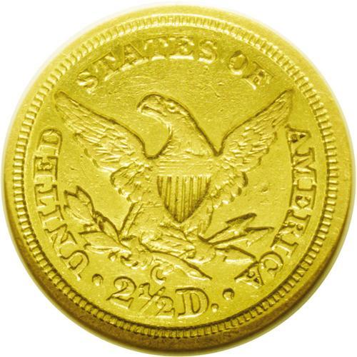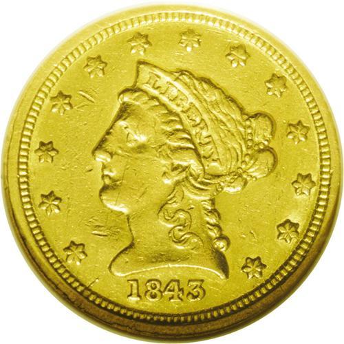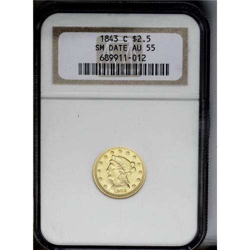 <B>1843-C<$2 1/2> Small Date, Crosslet 4 AU55 NGC.</B></I> Variety 4-C. The 1843-C Small Date is the lowest mintage Charlotte Mint quarter eagle, and is significantly scarcer than its Large Date counterpart. As usually seen with this variety, a bold die crack connects the bust tip to the rim, and the nearby field is swollen, courtesy of a failing obverse die. This slightly glossy example has substantial luster and a couple of moderate marks on the portrait. The obverse is nicely struck while the eagle's center is typically soft.