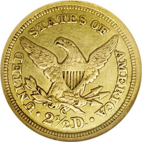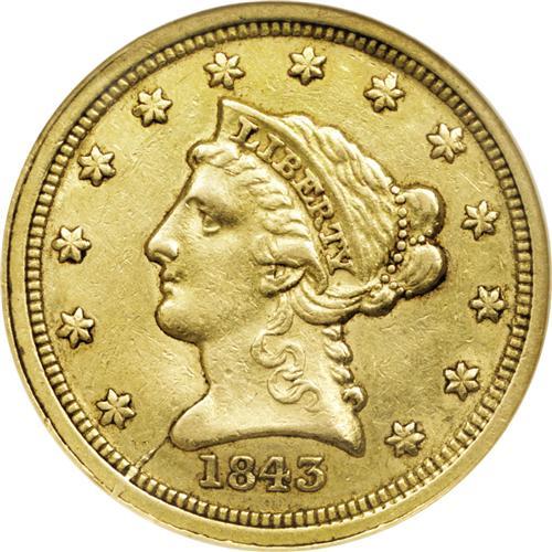 <B>1843-C $2 1/2 Small Date, Crosslet 4 AU55 NGC.</B></I> Variety 4-C. Die State III. Still-lustrous with pleasing yellow-gold color accented by hints of charcoal about the devices. Struck from a cracked and swollen obverse die, as nearly always, with a bulge visible at the tip of the neck. This usually affects the quality of strike on the reverse, but has little effect on this coin beyond the normal deficiency on the eagle. This issue's mintage of just 2,988 pieces not only makes it considerably scarcer than its Large Date counterpart, but also propels the 1843-C Small Date into elite status as the rarest Quarter Eagle issue from the Charlotte Mint. Census: 9 in 55, 19 finer (1/06).