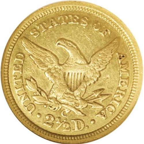 <B>1843-C $2 1/2 Small Date, Crosslet 4 AU55 NGC.</B></I> Variety 4-C. The 1843-C Small Date is the lowest mintage Charlotte Mint quarter eagle, and it is significantly scarcer than its Large Date counterpart. As usually seen with this variety, a bold die crack connects the bust tip to the rim, and the nearby field is swollen, courtesy of a failing obverse die. Of the 50-60 coins believed known of this major rarity, only 10-12 AU pieces are estimated to still exist. This slightly glossy example has substantial luster and a couple of moderate marks on the portrait. The obverse is nicely struck while the eagle's center is typically soft.<BR><BR><B>Coin Engraver:</B> Christian Gobrecht<BR><BR><b>Shipping:</b> Coins & Currency (<a target="_blank" href="http://www.heritageauctions.com/common/shipping.php">view shipping information</a>)