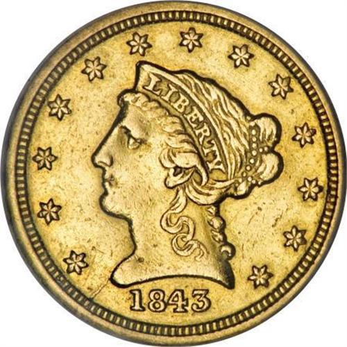 <B>1843-C $2 1/2 Small Date, Crosslet 4--Improperly Cleaned--NCS. AU Details.</B></I> Variety 4-C. From the standpoint of detail, this coin probably grades in the area of AU53 to AU55 but it has been clearly polished and fairly harshly cleaned at one time. The reverse fields also have a slightly "sweated" appearance, possibly from use at one time in jewelry. This is an affordable but reasonably presentable example of one of the rarest issues produced at the Charlotte Mint.<BR><I>From The Carolina Circle Collection.</B></I><BR><BR><B>Coin Engraver:</B> Christian Gobrecht<BR><BR><b>Shipping:</b> Coins & Currency (<a target="_blank" href="http://www.heritageauctions.com/common/shipping.php">view shipping information</a>)