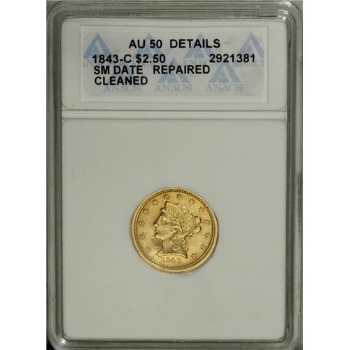 <B>1843-C $2 1/2 Small Date, Crosslet 4--Repaired, Cleaned--ANACS. AU50 Details.</B></I> Variety 4-C. Liberty's cheek and the left obverse field are smoothed, and the reverse field has several tiny marks. A pinscratch connects the ME in AMERICA. A rare low mintage Charlotte issue.<BR><BR><b>Shipping:</b> Coin/Currency (<a target="_blank" href="http://www.heritageauctions.com/common/shipping.php">view shipping information</a>)