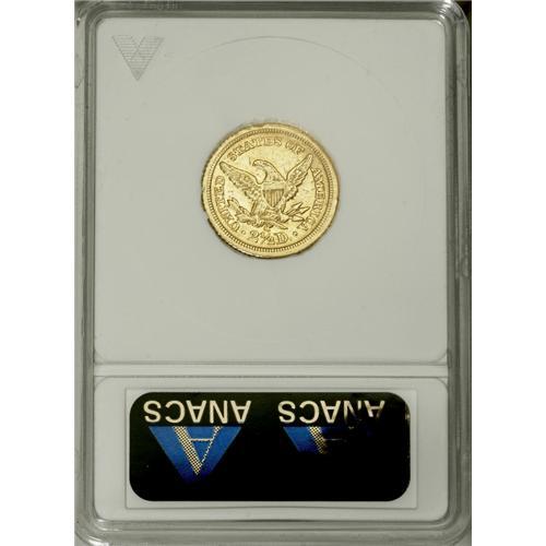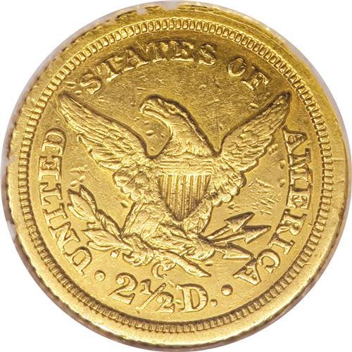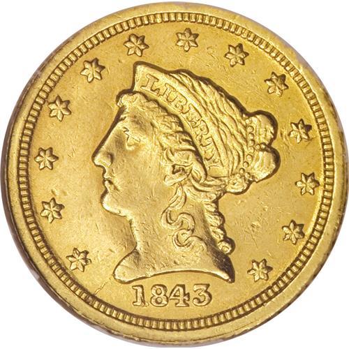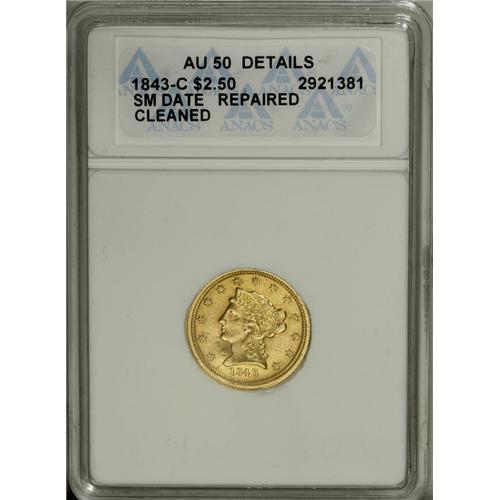 <B>1843-C $2 1/2 Small Date, Crosslet 4--Repaired, Cleaned--ANACS. AU50 Details.</B></I> Variety 4-C. Liberty's cheek and the left obverse field are smoothed, and the reverse field has several tiny marks. A pinscratch connects the ME in AMERICA. A rare low mintage Charlotte issue with fewer than 3,000 pieces believed struck.<BR><BR><b>Shipping:</b> Coin/Currency (<a target="_blank" href="http://www.heritageauctions.com/common/shipping.php">view shipping information</a>)