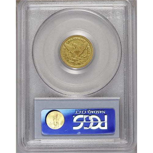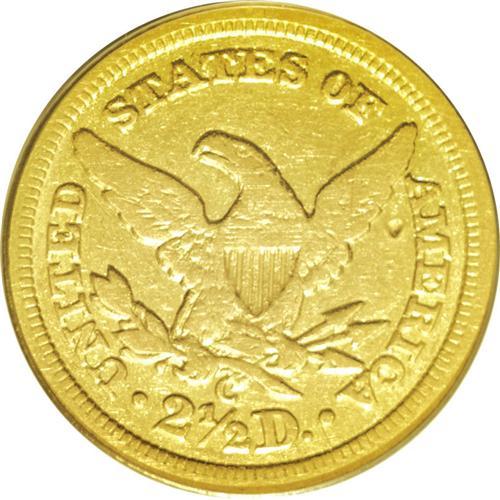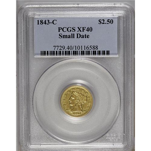 <B>1843-C<$2 1/2> Small Date, Crosslet 4 XF40 PCGS.</B></I> Variety 4-C. Die State III. The rarest Charlotte Mint quarter eagle, usually found in VF or XF condition. The late die state results in a bulge to the left of the date and above the bust truncation, and there is a crack from the bust to the rim. A bit of faded mint luster still clings to the protected areas around the obverse stars, and there are no singularly distracting contact marks, just moderate wear. A pleasing and attractive specimen of this rare issue.