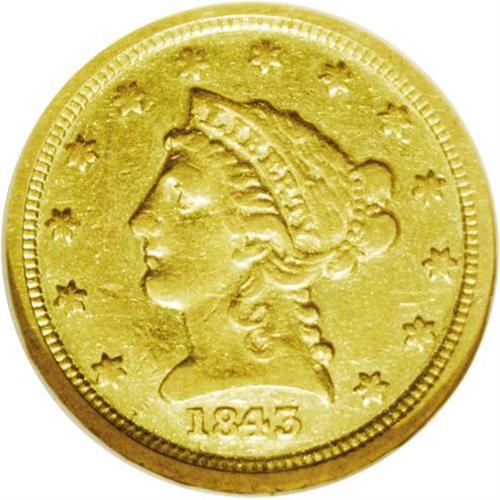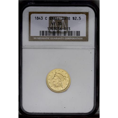 <B>1843-C<$2 1/2> Small Date VF30 NGC.</B></I> Winter 4-C. Die State III. The strike on the moderately worn example offered here is decent for a '43-C Small Date, with the later die state resulting in a slight bulge to the left of the date. A small punch mark is noticed in the reverse field below the eagle's right (facing) wing.<BR><I>From The Steve Glenn Collection.</B></I> <BR><BR><B>Important notice:</B> Heritage usually auctions material at the rate of 200-250 lots per hour. On some occasions eBay Live bid software or the Internet may not be able to keep up with the pace of the auction. We recommend placing a realistic absentee bid now as insurance to avoid disappointment. Occasionally the auctioneer may eliminate or reject an eBay Live bid, and the auctioneer may also reopen a lot after the close of the eBay live bidding (usually because we missed an audience bid), and may reject your bid even if it shows you as the winning bidder. By bidding via eBay Live, you agree that Heritage may award the lot to another bidder at its sole discretion under the circumstances described above or any other reasonable circumstances. Since eBay bids are not shown to us until we open the lot on the floor, we treat those bids just like floor bids. In most cases the floor responds before the eBay bid is presented to us, due to Internet lag time, so for consistency we have made it a policy that floor bids are always considered first over tie eBay live bids. Also please note that all Heritage lots purchased through eBay Live carry a 20% Buyer's Premium. Please make sure you read the Terms and Conditions before you bid. This lot is being auctioned in conjunction with a live floor auction by Heritage Galleries & Auctioneers. All final auction and invoice information will be supplied by Heritage Galleries & Auctioneers, and all other information should be considered preliminary. Lot:2362 <BR><BR><B>Winning Notification and Billing:</B> After the FINAL session in this auction is complete, Heritage will send e-mail and snail mail invoices. This process normally takes several days. All final auction and invoice information will be supplied by Heritage Galleries & Auctioneers, and all other information should be considered preliminary. <BR><BR>This auction will be conducted on a live auction floor and over the Internet through eBay Live. If you choose to place an absentee bid, please take a moment to <font color='#0000ff'><u><a href='http://pages.ebay.com/liveauctions/help/before/laabsentee.html'>learn how eBay Live absentee bidding works</a></u></font><font color='#000000'>