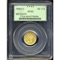 <table><tr><td><TABLE cellSpacing=0 cellPadding=0 width="100%" bgColor=#000000 border=0><TBODY> <TR><TD width="100%"><TABLE cellSpacing=1 cellPadding=3 width="100%" border=0><TBODY><TR><TD width="100%" bgColor=#79735c><FONT face=arial color=#ffffff size=3><B>Description</B> </FONT></TD></TR><TR><TD width="100%" bgColor=#ffffff><FONT face=arial size=2><B>1843-C $2 1/2 Small Date XF40 PCGS.</B></I> Winter 4-C. The Small Date 1843-C is regarded as the rarest Charlotte Mint Quarter Eagle issue. Only 2,988 pieces were struck, and southern mint gold expert Douglas Winter believes that just 50 to 60 examples have survived in all grades. A late die state of this variety, which has a heavy die break (as made) from the bust tip to the rim. The eagle is typically struck, while the obverse also shows softness on some of Liberty's hair curls. There are ample glimpses of mildly prooflike luster, however, and the only abrasion of note is a short pinscratch in the field above the eagle's neck. Encapsulated in an older green-label holder. Population: 5 in 40, 27 finer (9/03).<BR><I>From the Holman Family Collection.</B></I> </FONT></TD></TR></TBODY></TABLE></TD></TR></TBODY></TABLE><BR><A name=PricesRealized></A><TABLE cellSpacing=0 cellPadding=0 width="100%" bgColor=#000000 border=0><TBODY><TR><TD width="100%"><TABLE cellSpacing=1 cellPadding=3 width="100%" border=0><TBODY><TR><TD width="100%" bgColor=#79735c><A name=PR><FONT face=arial color=#ffffff size=3><B>Previous Prices from Heritage Auctions</B> </FONT></A></TD></TR><TR><TD bgColor=#f6f6ed><TABLE cellSpacing=0 cellPadding=0 width="100%" border=1><TBODY><TR><TD align=middle width="33%"><B>Date</B></TD><TD align=middle width="33%"><B>Service</B></TD><TD align=middle width="33%"><B>Price</B></TD></TR><TR bgColor=whitesmoke><TD width="33%"><B>08/13/1999</B></TD><TD width="33%">NGC</TD><TD width="33%">$3,335.00</TD></TR><TR bgColor=whitesmoke><TD width="33%"><B>01/01/1995</B></TD><TD width="33%">PCGS</TD><TD width="33%">$6,600.00</TD></TR></TBODY></TABLE></TD></TR><TR><TD bgColor=#ffffff><FONT face=arial size=1 ?>PLEASE NOTE: All prices realized reflect the final hammer price PLUS the buyer's premium in auctions that charge a buyer's premium. Each item has a notation at the top of the listing indicating whether that lot included a buyer's premium. Example: A item that sells with a final hammer price of $100 and a 20% buyer's premium will display with a price realized of $120. All information listed is intended to be as accurate as possible, but errors are possible. Please use this guide carefully and inform us of any inaccuracies. </FONT></TD></TR></TBODY></TABLE></TD></TR></TBODY></TABLE><BR><TABLE cellSpacing=0 cellPadding=0 width="100%" bgColor=#000000 border=0><TBODY><TR><TD width="100%"><TABLE cellSpacing=1 cellPadding=3 width="100%" border=0><TBODY><TR><TD width="100%" bgColor=#79735c colSpan=6><FONT face=arial color=#ffffff size=3><B>Price Guide*</B> </FONT></TD></TR><TR bgColor=#f6f6ed><TD align=middle><B>Grade</B> </TD><TD align=middle><B>Coin World<BR>(Trends)</B> </TD><TD align=middle><B>Numismedia<BR>Retail</B> </TD><TD align=middle><B>Numismedia<BR>Wholesale</B> </TD><TD align=middle><B>Coin<BR>Universe</B> </TD><TD align=middle><B>Heritage<BR>Value Index</B> </TD></TR><TR bgColor=#ffffff><TD align=middle>35</TD><TD align=right>---</TD><TD align=right>---</TD><TD align=right>---</TD><TD align=right>---</TD><TD align=right>$3,096.25</TD></TR><TR style="FONT-WEIGHT: bold" bgColor=#cccfdd><TD align=middle>40</TD><TD align=right>$5,000.00</TD><TD align=right>---</TD><TD align=right>---</TD><TD align=right>$6,250.00</TD><TD align=right>$3,870.00</TD></TR><TR bgColor=#ffffff><TD align=middle>45</TD><TD align=right>$6,000.00</TD><TD align=right>---</TD><TD align=right>---</TD><TD align=right>---</TD><TD align=right>$5,069.17</TD></TR><TR bgColor=#ffffff><TD colSpan=6><FONT size=1>*All information listed is intended to be as accurate as possible, but errors are possible. No item may be returned or refused based on this information which is provided as a service to our customers. You should contact each pricing source directly to determine the accuracy of this information. </FONT></TD></TR></TBODY></TABLE></TD></TR></TBODY></TABLE><BR><TABLE cellSpacing=0 cellPadding=0 width="100%" bgColor=#000000 border=0><TBODY><TR><TD width="100%"><TABLE cellSpacing=1 cellPadding=3 width="100%" border=0><TBODY><TR><TD width="100%" bgColor=#79735c><FONT face=arial color=#ffffff size=3><B>Population Guide</B> </FONT></TD></TR><TR bgColor=#ffffff><TD align=middle><!-- Begin Output of Population Grid--><TABLE cellSpacing=0 cellPadding=0 width="100%" border=0><TBODY><TR><TD vAlign=center><TABLE cellSpacing=0 width="100%" border=1 cellsadding="3"><TBODY><TR><TD vAlign=center><TABLE cellSpacing=0 cellPadding=3 width="100%" border=1><TBODY><TR><TD vAlign=center align=middle bgColor=#f0f1e8 colSpan=2 <CENTER><FONT face=Arial size=2><B>PCGS Pop </B></FONT><CENTER></CENTER></TD><TD vAlign=center align=middle bgColor=#f0f1e8 colSpan=2><CENTER><FONT face=Arial size=2><B>NGC Pop</B></CENTER></FONT></TD></TR><TR><TD vAlign=center><FONT face=Arial size=2>(40)</FONT> </TD><TD vAlign=center align=right><FONT face=Arial size=2>5</FONT> </TD><TD vAlign=center><FONT face=Arial size=2>(40)</FONT> </TD><TD vAlign=center align=right><FONT face=Arial size=2>4</FONT> </TD></TR><TR><TD vAlign=center><FONT face=Arial size=2>(>40)</FONT> </TD><TD vAlign=center align=right><FONT face=Arial size=2>29</FONT> </TD><TD vAlign=center><FONT face=Arial size=2>(>40)</FONT> </TD><TD vAlign=center align=right><FONT face=Arial size=2>30</FONT> </TD></TR></TBODY></TABLE></TD></TR></TBODY></TABLE></TD></TR></TBODY></TABLE><!-- End Output of Population Grid--></TD></TR></TBODY></TABLE></TD></TR></TBODY></TABLE><BR><TABLE cellSpacing=0 cellPadding=0 width="100%" bgColor=#000000 border=0><TBODY><TR> Important notice: Heritage usually auctions material at the rate of 200-250 lots per hour. On some occasions