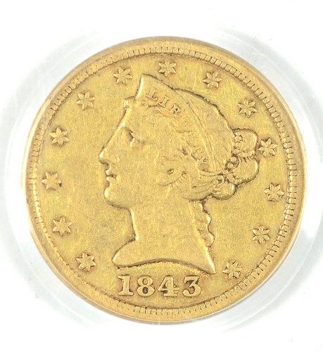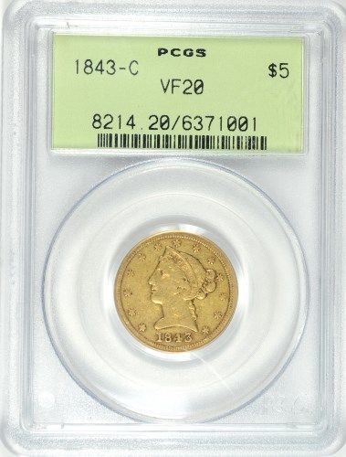 1843-C $5.00 GOLD, PCGS VF-20 GREEN LABEL, SUPER RARE, LOW MINTAGE! GREAT COIN