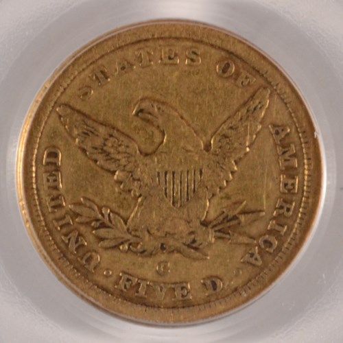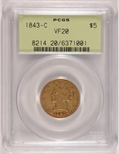 1843-C $5.00 GOLD, PCGS VF-20 GREEN LABEL, SUPER RARE, LOW MINTAGE! GREAT COIN