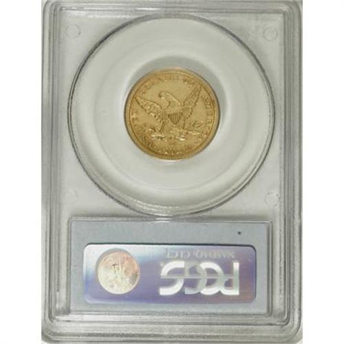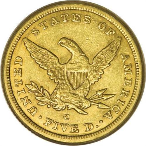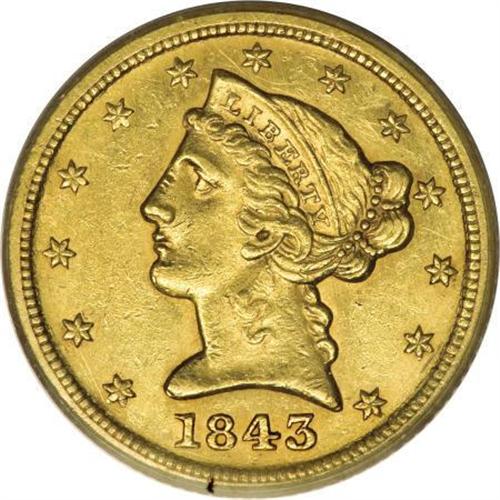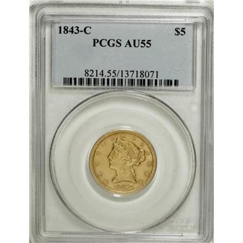 <B>1843-C $5 AU55 PCGS.</B></I> Variety 6-C. This is a solid coin for the grade with some scattered ticks seen on the obverse and reverse. There are a few hairlines over the head of Liberty but this coin gets points for its originality and it has never been cleaned or over-dipped. Both sides show pleasing light to medium yellow gold with delicate rose overtones. The strike is sharp except on the eagle's neck feathers which, as usual, are weak. <BR> The 1843-C is actually one of the scarcer Charlotte half eagles in terms of overall rarity, but it is somewhat more available in higher grades than is usually assumed. It appears that a small hoard was found within the last decade or so as at least four or five comparatively high grade pieces (in the MS62 to MS64 range) have appeared in the market and all have similar surfaces. The finest is still the Miller/Milas coin that brought $55,000 all the way back in May 1995. It is currently in a PCGS MS64 holder.<BR><I>From The Carolina Circle Collection.</B></I><BR><BR><B>Coin Engraver:</B> Christian Gobrecht<BR><BR><b>Shipping:</b> Coins & Currency (<a target="_blank" href="http://www.heritageauctions.com/common/shipping.php">view shipping information</a>)