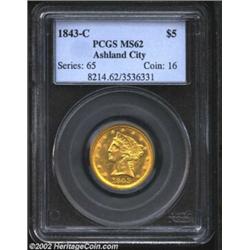 1843-C $5 MS62 PCGS. Winter 6-C. Die State II. A very scarce S-mint Half Eagle in all grades with high grade pieces among the rarest in the series. The Ashland City Collection contains not one but an amazing two Uncirculated coins of this issue. This is a lower Condition Census example that has bright mint luster and attractive orange-gold coloration. Relatively sharp for the grade with only slight softness on Liberty's hair curls and the eagle's neck. A couple of larger marks in the left obverse field (in front of Liberty's nose) account for the grade, and there is a shallow planchet flake in the field just in front of Liberty's chin.From the Ashland City Collection. Important notice: We expect to be auctioning lots at the rate of 200-250 per hour. Sometimes eBay Premier live bid software cannot keep up with that pace, so we strongly recommend that you place a realistic proxy bid now as insurance to avoid disappointment. Also please note that all Heritage/CAA lots purchased through eBay Premier carry a 20% Buyer's Premium. Please make sure you read the Terms and Conditions.
