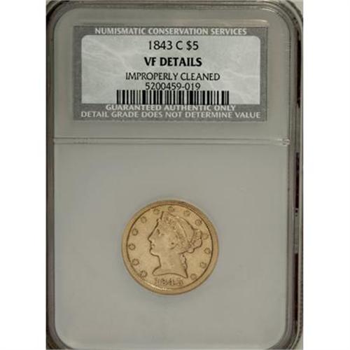 <B>1843-C $5 --Improperly Cleaned--NCS. VF Details.</B></I> Variety 6-C. This scarce Charlotte half eagle is slightly bright, but would satisfy many collectors of the series. Typically struck on the major devices, although many stars display centril detail.<BR><BR><B>Coin Engraver:</B> Christian Gobrecht<BR><BR><b>Shipping:</b> Coins & Currency (<a target="_blank" href="http://www.heritageauctions.com/common/shipping.php">view shipping information</a>)
