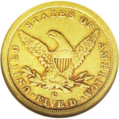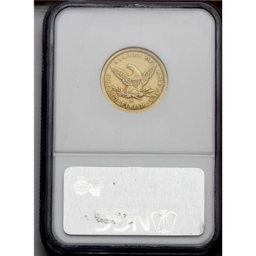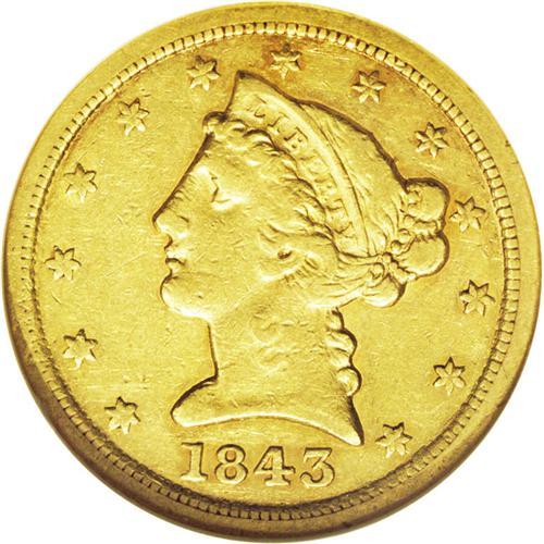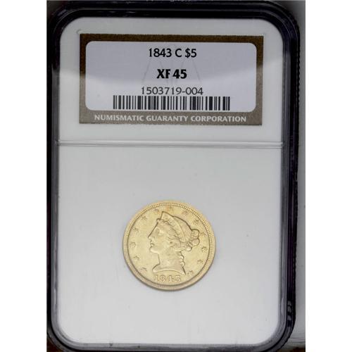 <B>1843-C<$5> XF45 NGC.</B></I> Variety 6-C. Two reverse dies are known for the 1843-C, but the mintmark location is similar. This moderately circulated example displays ample orange-tinged luster, and only minor marks are located. The major devices are typically struck, while peripheral elements show stronger strike definition. The 1843-C is more difficult than implied by its mintage of 44,277 pieces.