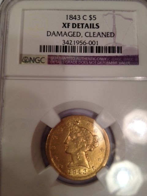 1843-C CHARLOTTE MINT VERY RARE $5 GOLD LIBERTY, NGC XF DETAILS, ONLY 44,000 MINTED