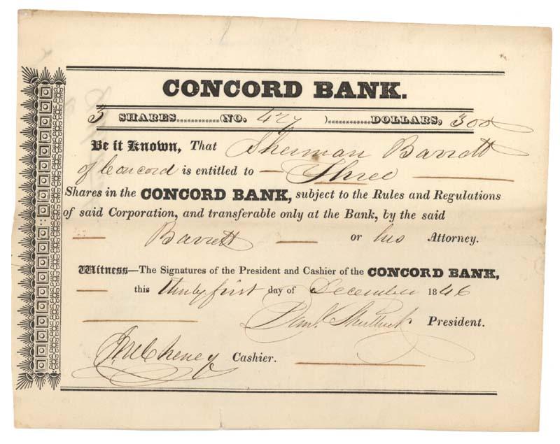 1846, Massachusetts. Stock certificate for 3 shares. Scarce. Uncancelled. Small edge tear at top margin. Fine.