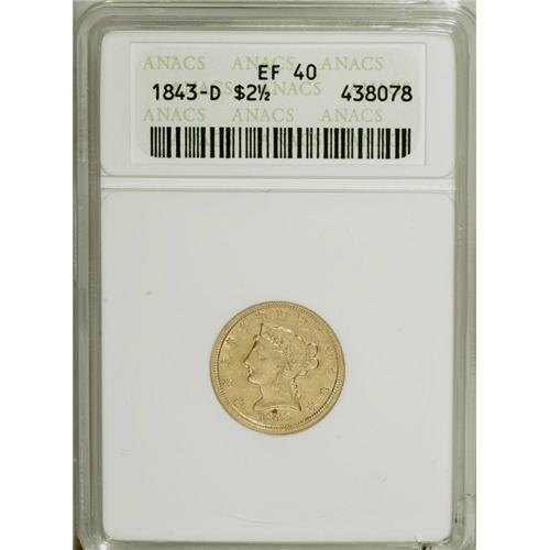 <B>1843-D $2 1/2 Large D XF40 ANACS.</B></I> Variety 4-H. The bright yellow-gold surfaces show scattered handling marks, none particularly jarring. Evenly worn with suitable definition on all but the highpoints. A crimson copper spot between the bust and date can serve as a pedigree marker.<BR><BR><b>Shipping:</b> Coin/Currency (<a target="_blank" href="http://www.heritageauctions.com/common/shipping.php">view shipping information</a>)