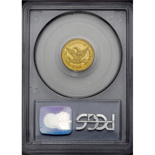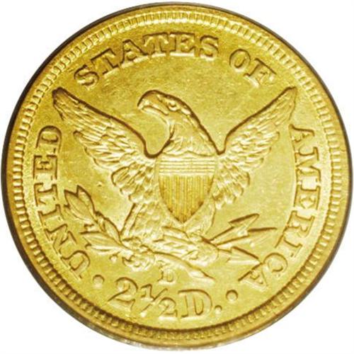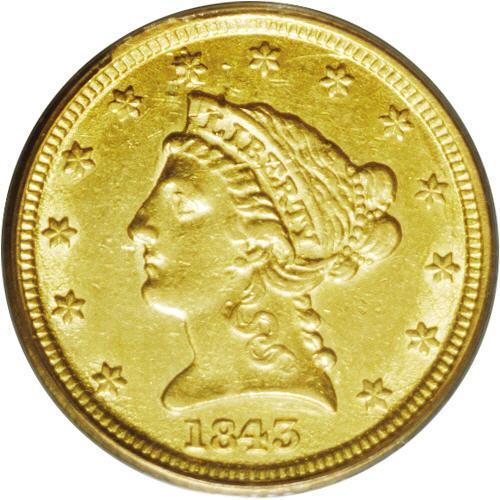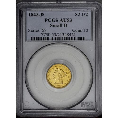 <B>1843-D<$2 1/2> Small D AU53 PCGS.</B></I> Variety 4-F. A radial die crack that passes through the F in OF is diagnostic of this more obtainable die marriage. Bright, well struck surfaces have an appealing reddish tint over the green-gold alloy. A pair of deeper marks above the portrait are the most noticeable distraction.<BR><I>From The Steve Glenn Collection.</B></I> <BR><BR><B>Important notice:</B> Heritage usually auctions material at the rate of 200-250 lots per hour. On some occasions eBay Live bid software or the Internet may not be able to keep up with the pace of the auction. We recommend placing a realistic absentee bid now as insurance to avoid disappointment. Occasionally the auctioneer may eliminate or reject an eBay Live bid, and the auctioneer may also reopen a lot after the close of the eBay live bidding (usually because we missed an audience bid), and may reject your bid even if it shows you as the winning bidder. By bidding via eBay Live, you agree that Heritage may award the lot to another bidder at its sole discretion under the circumstances described above or any other reasonable circumstances. Since eBay bids are not shown to us until we open the lot on the floor, we treat those bids just like floor bids. In most cases the floor responds before the eBay bid is presented to us, due to Internet lag time, so for consistency we have made it a policy that floor bids are always considered first over tie eBay live bids. Also please note that all Heritage lots purchased through eBay Live carry a 20% Buyer's Premium. Please make sure you read the Terms and Conditions before you bid. This lot is being auctioned in conjunction with a live floor auction by Heritage Galleries & Auctioneers. All final auction and invoice information will be supplied by Heritage Galleries & Auctioneers, and all other information should be considered preliminary. Lot:2364 <BR><BR><B>Winning Notification and Billing:</B> After the FINAL session in this auction is complete, Heritage will send e-mail and snail mail invoices. This process normally takes several days. All final auction and invoice information will be supplied by Heritage Galleries & Auctioneers, and all other information should be considered preliminary. <BR><BR>This auction will be conducted on a live auction floor and over the Internet through eBay Live. If you choose to place an absentee bid, please take a moment to <font color='#0000ff'><u><a href='http://pages.ebay.com/liveauctions/help/before/laabsentee.html'>learn how eBay Live absentee bidding works</a></u></font><font color='#000000'>