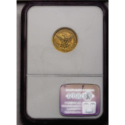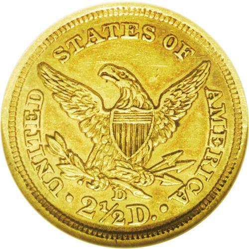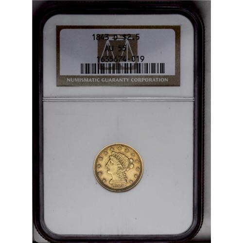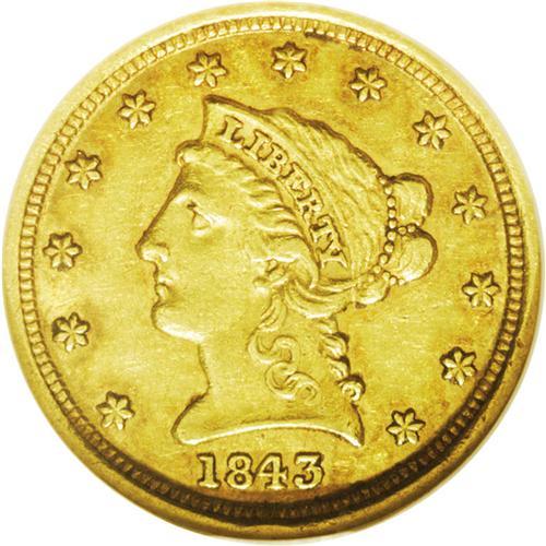 <B>1843-D<$2 1/2> Small D AU55 NGC.</B></I> Variety 4-F. This well struck golden-brown Dahlonega type coin benefits from ample luster and a paucity of detrimental marks. The mintmark is small and distant from the fraction bar; the usual reverse variety for the '43-D. Those who seek a problem-free D-mint Liberty quarter eagle need look no further than the present lot.
