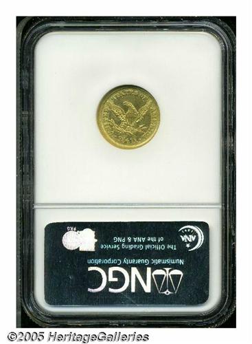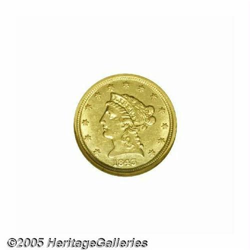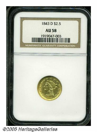 <B>1843-D<$2 1/2> Small D AU58 NGC.</B></I> Variety 4-F. This is the most common of three small mintmark die pairings for the issue and can be distinguished by a die crack that passes through the F in OF and into the field. The bright green-gold surfaces are very well struck throughout. A minimally marked specimen with no singularly mentionable identifiers.