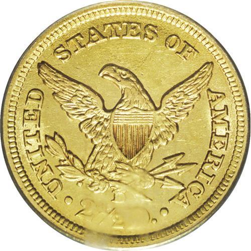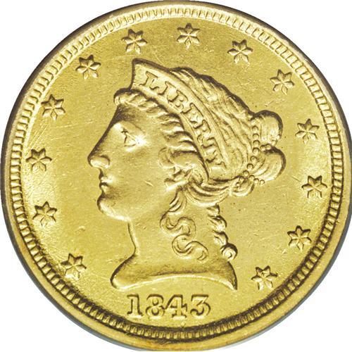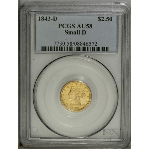 <B>1843-D $2 1/2 Small D AU58 PCGS.</B></I> Variety 4-F. Well struck for a Dahlonega product, and the rich peripheral luster is exceptional for the AU58 level. Best of all, neither side shows any mentionable marks, even with the aid of a loupe. Despite a low mintage of 36,209 pieces, at least three die marriages are known, which include two different-sized mintmark punches. Population: 18 in 58, 11 finer (10/06).<BR><BR><b>Shipping:</b> Coin/Currency (<a target="_blank" href="http://www.heritageauctions.com/common/shipping.php">view shipping information</a>)