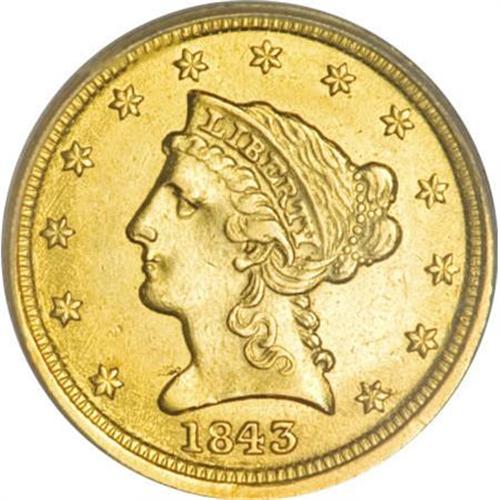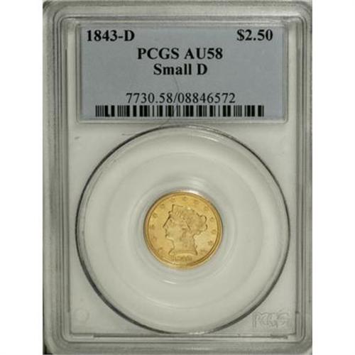 <B>1843-D $2 1/2 Small D AU58 PCGS.</B></I> Variety 4-F. Well struck for a Dahlonega product, and the rich peripheral luster is exceptional for the AU58 level. Best of all, neither side shows any mentionable marks, even with the aid of a loupe. Despite a low mintage of 36,209 pieces, at least three die marriages are known, which include two different-sized mintmark punches. Population: 18 in 58, 11 finer (12/07).<BR><BR><B>Coin Engraver:</B> Christian Gobrecht<BR><BR><b>Shipping:</b> Coins & Currency (<a target="_blank" href="http://www.heritageauctions.com/common/shipping.php">view shipping information</a>)