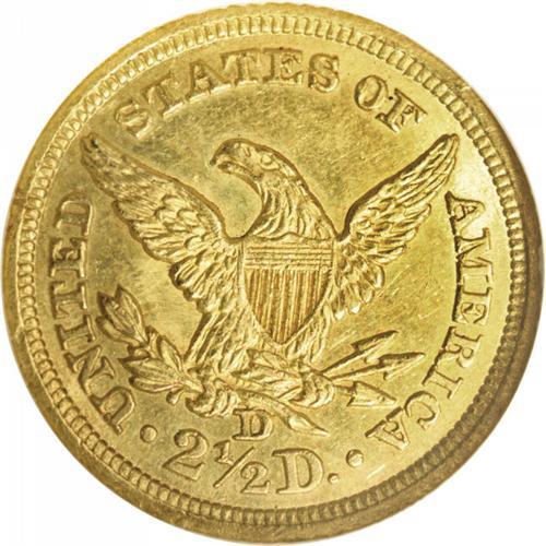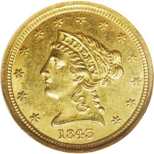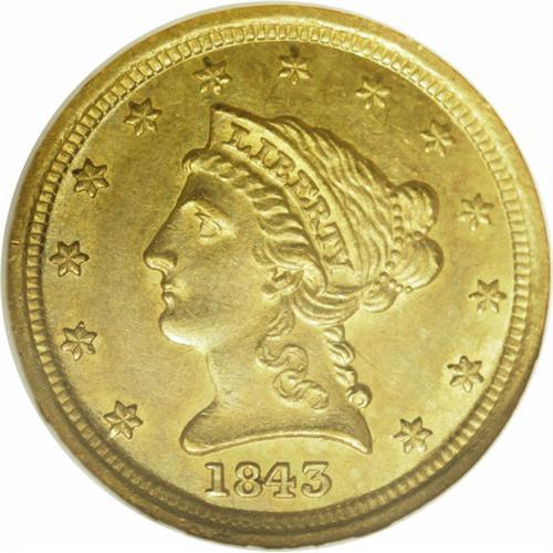 <B>1843-D<$2 1/2> Small D MS62 NGC.</B></I> Variety 4-F. Early die state with perfect dies. This is the most common of the four varieties of this year.<BR> This is as pretty a coin for the grade as one can possibly imagine with superb deep, even green-gold color seen on both obverse and reverse. This color is clearly indicative of the fact that this coin has never been cleaned or lightened and it is one of the more attractive quarter eagles in this entire collection, despite its comparatively "low" grade. The surfaces are extremely clean and lack the marks typically associated with the MS62 grade. Nearly all of the detail is up and bold, and this is really an impressive example.<BR> Production of quarter eagles at the Dahlonega Mint increased significantly in 1843, and there were more pieces struck this year than in the previous four years combined. Of the 36,209 1843-D quarter eagles made, there are probably more than 300 pieces known today. This date is easily found in grades up to and including AU55, but it is rare and greatly underappreciated in Mint State. We do not know of more than a half dozen Uncirculated coins, with the finest of these being the PCGS MS63 from the Green Pond Collection, sold by Heritage in 2004.<BR> After the heady prices that the preceding four coins bring, this 1843-D will not seem like anything special, but it is actually one of the most cosmetically appealing coins in this collection and a true rarity in this grade.<BR><I>Ex: Leon Farmer Collection; Hancock and Harwell. This is the plate coin in the first edition of Doug Winter's</B></I> Gold Coins of the Dahlonega Mint, 1838-1861.<BR><I>From The Duke's Creek Collection of Dahlonega Gold.</B></I>