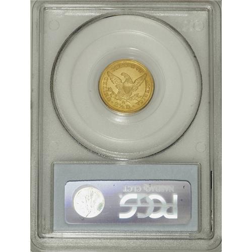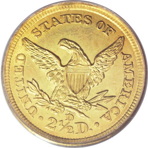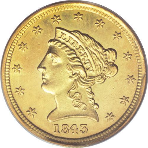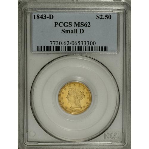 <B>1843-D $2 1/2 Small D MS62 PCGS.</B></I> Variety 4-D. Major varieties of this date are known with either a Large D or a Small D as illustrated by this example. The Small D variation is much more plentiful, but all are rare in Mint State grades. In circulated grades, this date is considered an excellent candidate for type set collectors, although only about a dozen Mint State examples are known. Both sides of this lovely piece are fully detailed. The surfaces have fully brilliant light green-gold surfaces with satiny, slightly reflective luster. Population: 5 in 62, 2 finer (3/07).<BR><BR><b>Shipping:</b> Coins & Currency (<a target="_blank" href="http://www.heritageauctions.com/common/shipping.php">view shipping information</a>)