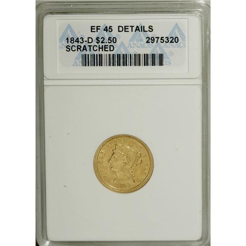 <B>1843-D $2 1/2 Small D--Scratched--ANACS. XF45 Details.</B></I> Variety 4-D. An early die state without the usual vertical die crack from the stem. This richly detailed Dahlonega gold piece has a concealed pinscratch from the base of the shield to 4:30, and a more noticeable pinscratch from the eagle's left (facing) shoulder to 4 o'clock.<BR><BR><b>Shipping:</b> Coins & Currency (<a target="_blank" href="http://www.heritageauctions.com/common/shipping.php">view shipping information</a>)