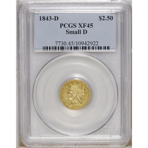 <B>1843-D $2 1/2 Small D XF45 PCGS.</B></I> Variety 4-D. Somewhat weak in hair detail, this is a specimen that suffers more of strike than wear. It has an even haze of light, uniformed circulation, but still exhibits ample mint luster adjacent to peripheral stars and lettering.<BR><BR><b>Shipping:</b> Coin/Currency (<a target="_blank" href="http://www.heritageauctions.com/common/shipping.php">view shipping information</a>)
