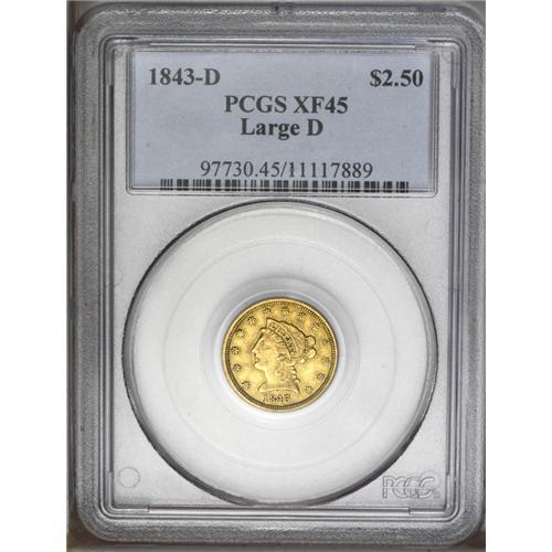 <B>1843-D<$2 1/2> Small D XF45 PCGS.</B></I> Variety 4-D. Incorrectly designated as a Large D on the PCGS holder. This evenly worn piece has deep, dark yellow color, with a dark spot beneath the denomination. Two significant abrasions are noted in the obverse fields. An excellent choice for those seeking an affordable example of Dahlonega gold.