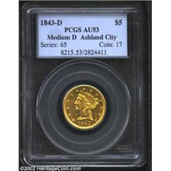 1843-D $5 Large D AU53 PCGS. Winter 8-G. Only two varieties are known of this issue, this being the more common (some call it a Medium D, others a Large D). The 1843-D is one of the more available D-mint Fives, with AU examples such as this even available on a fairly regular basis for the type collector. Well struck throughout, the bright orange-gold surfaces show a couple of distracting abrasions on the obverse, the most obvious being a shallow scratch across Liberty's face and into the left obverse field and another couple of marks in the lower left obverse field.From the Ashland City Collection. Important notice: We expect to be auctioning lots at the rate of 200-250 per hour. Sometimes eBay Premier live bid software cannot keep up with that pace, so we strongly recommend that you place a realistic proxy bid now as insurance to avoid disappointment. Also please note that all Heritage/CAA lots purchased through eBay Premier carry a 20% Buyer's Premium. Please make sure you read the Terms and Conditions.