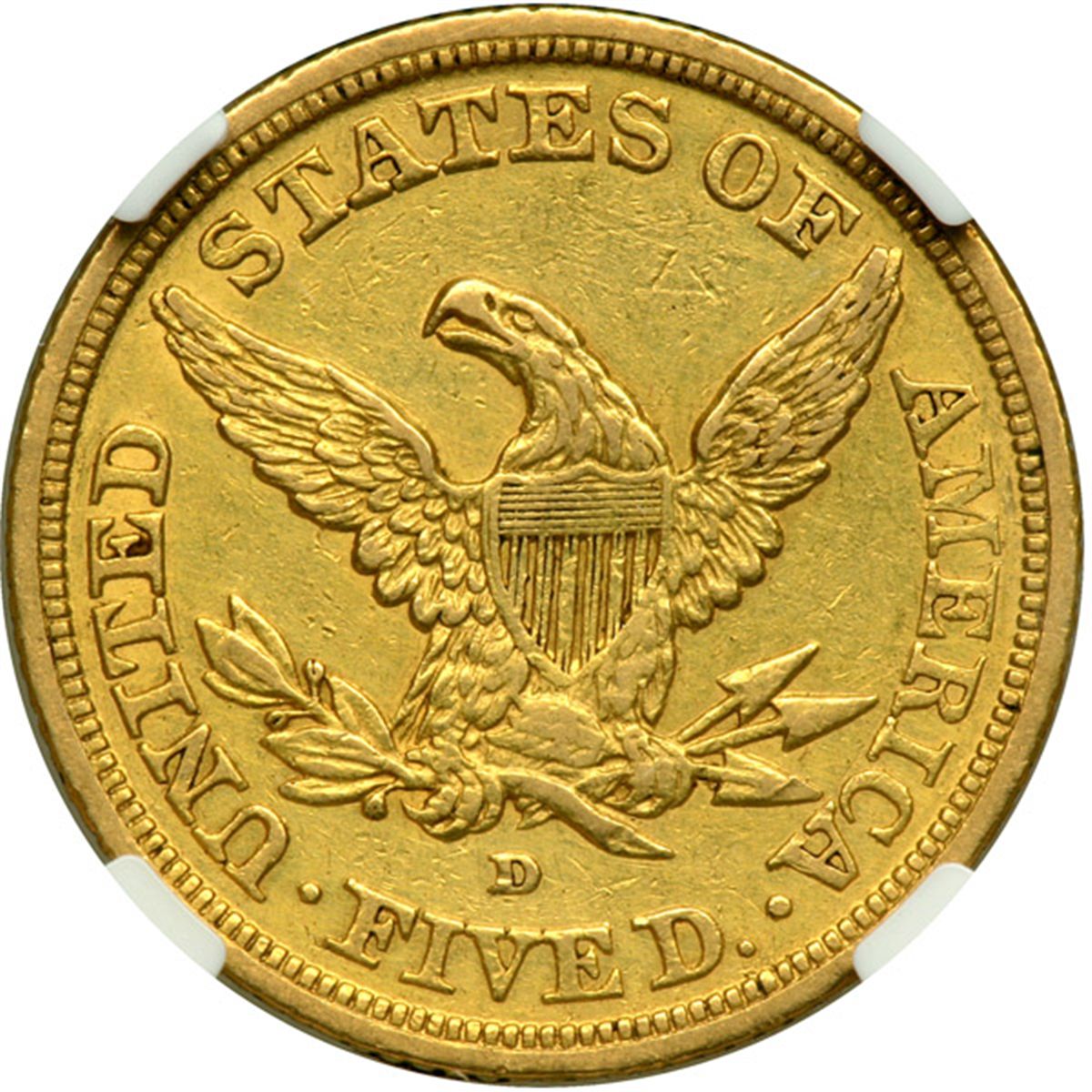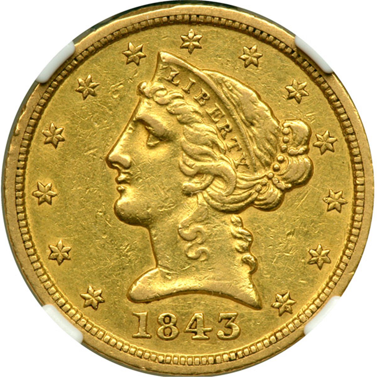 1843-D $5 Liberty. NGC AU Details, improperly cleaned. Light uniform golden color. We feel that this example should have been given at least an EF-45 grade. Only 98,452 minted of which merely 100 examples are estimated to have survived.