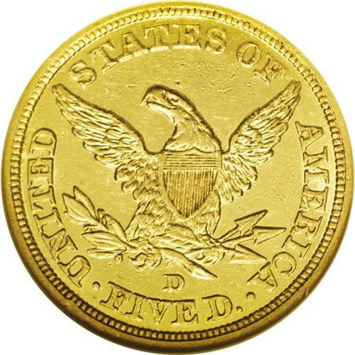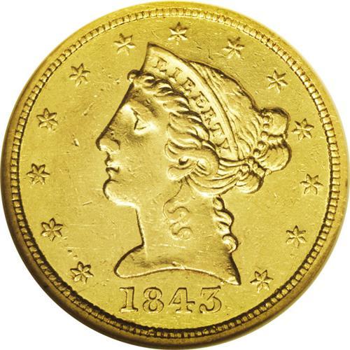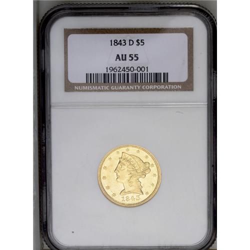 <B>1843-D<$5> Medium D AU55 NGC.</B></I> Variety 10-H. Glimmers of bright luster are particularly extensive across the reverse device and border. This bright piece is void of dirt and displays consistent white-gold color. No marks are remotely worthy of discussion, and the strike is also pleasing, considering the mint of origin.