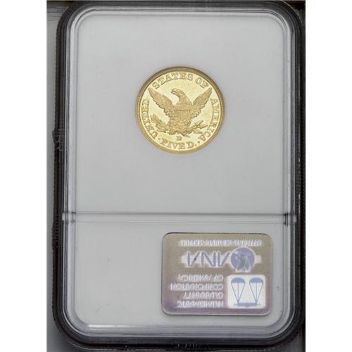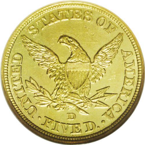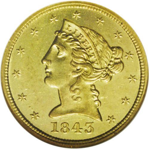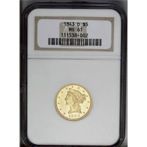 <B>1843-D $5 Medium D MS61 NGC.</B></I> Variety 10-H. Three tiny die lumps are located between the first and second obverse stars, with others below the 12th star and above 43 in the date. The mintmark is between the V and E in FIVE. Well struck on the highpoints of the design, the green-gold surfaces show some wispy lines in the fields. The devices and the bright, semi-prooflike fields are largely free of coin-to-coin marks or abrasions. In terms of eye appeal, this piece would certainly seem to be undergraded. One of the more available Dahlonega half eagles, the '43-D is often the date chosen for high grade type sets. NGC and PCGS have each certified just five better grade examples, from a mintage of nearly 100,000 coins. Census: 10 in 61, 5 finer (8/06).<BR><BR><b>Shipping:</b> Coin/Currency (<a target="_blank" href="http://www.heritageauctions.com/common/shipping.php">view shipping information</a>)