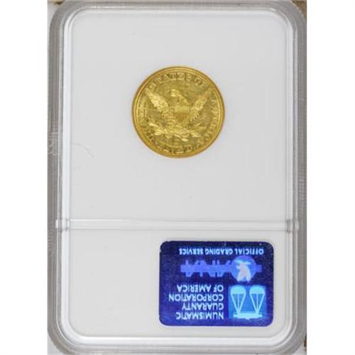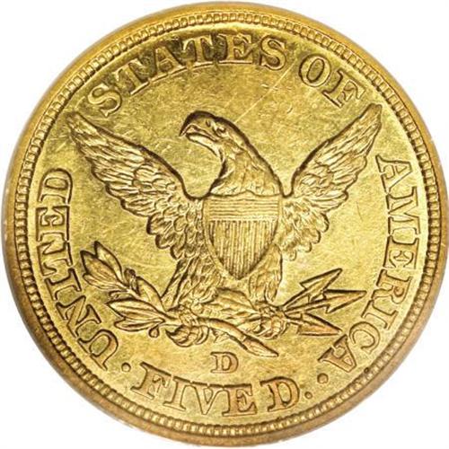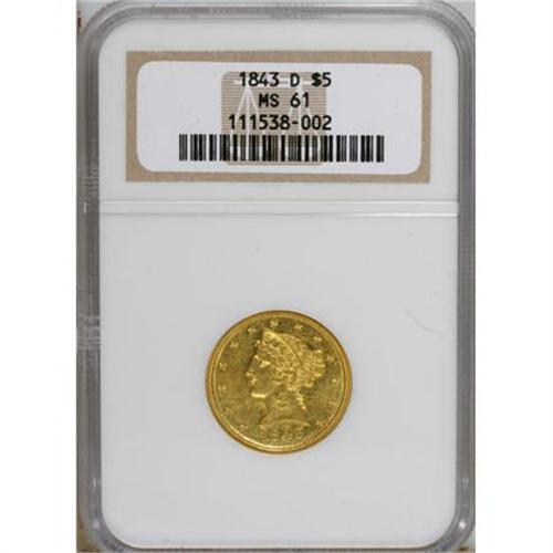 <B>1843-D $5 Medium D MS61 NGC.</B></I> Variety 10-H. Three tiny die lumps are located between the first and second obverse stars, with others below the 12th star and above 43 in the date. The mintmark is between the V and E in FIVE. Well struck on the highpoints of the design, the green-gold surfaces show some wispy lines in the fields. The devices and the bright, semi-prooflike fields are largely free of coin-to-coin marks or abrasions. In terms of eye appeal, this piece certainly seems undergraded. One of the more available Dahlonega half eagles, the '43-D is often the date chosen for high grade type sets. Census: 10 in 61, 4 finer (6/07).<BR><BR><B>Coin Engraver:</B> Christian Gobrecht<BR><BR><b>Shipping:</b> Coins & Currency (<a target="_blank" href="http://www.heritageauctions.com/common/shipping.php">view shipping information</a>\)